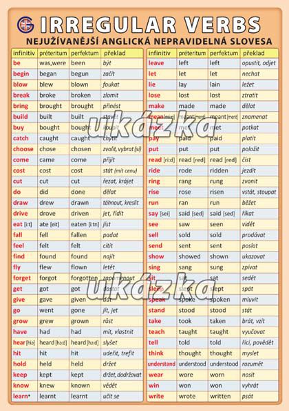 Přehled tvarů préterita a perfekta nejužívanějších nepravidelných sloves. Nezbytná pomůcka pro všechny studenty angličtiny.