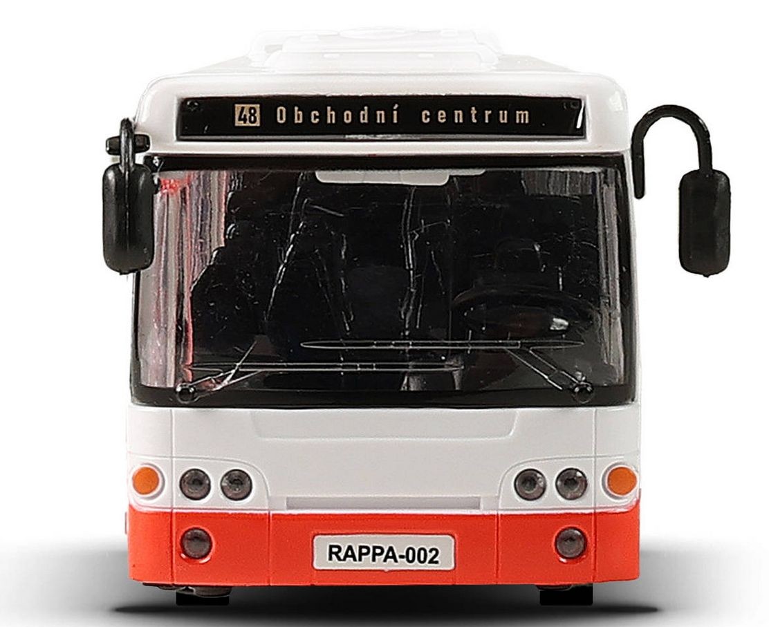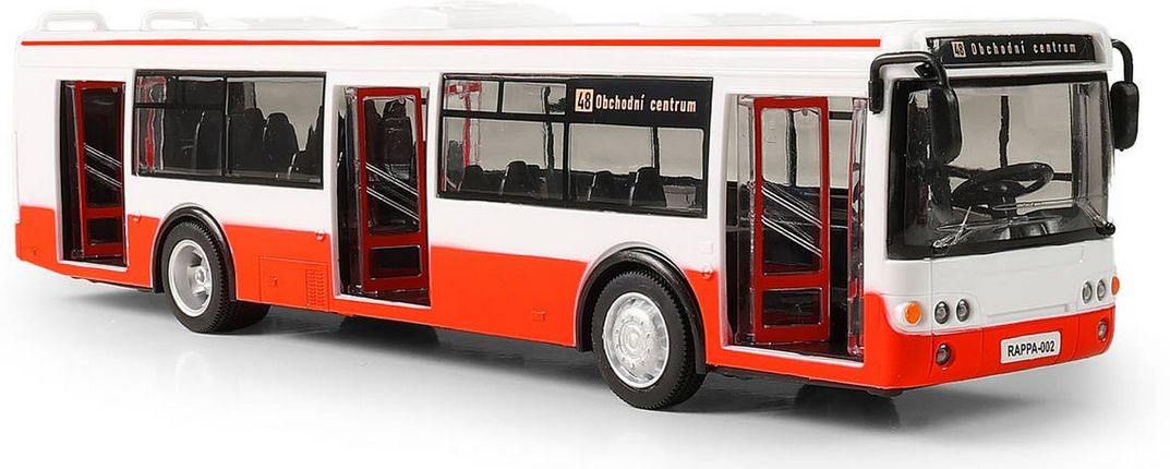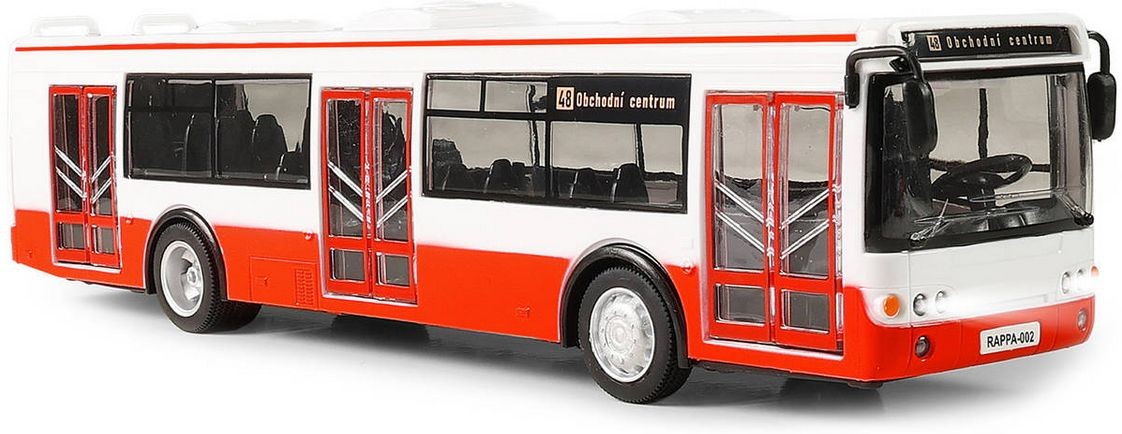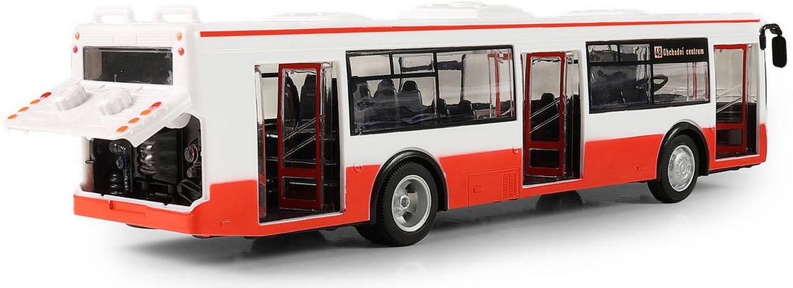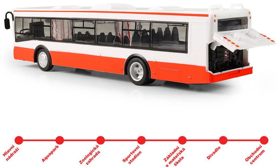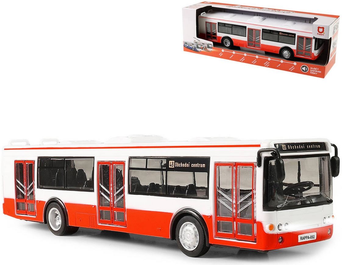 Popis Autobus česky hlásí zastávky červený 28cm, zpětné natažení, na baterie