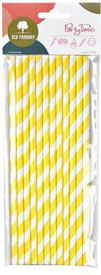 Papírová brčka se žlutými pruhy.