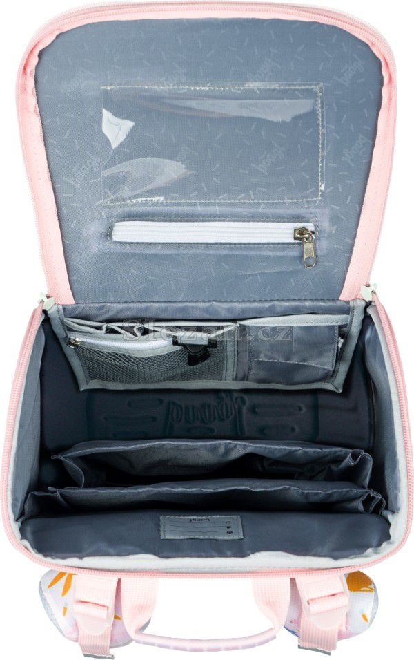 Uvnitř aktovky je průhledná kapsa na rozvrh a vnitřní organizér umožňující rovnoměrné rozložení hmotnosti, doplněný gumičkou pro fixaci.
