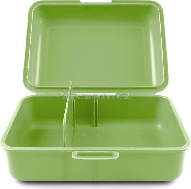 • Plastový box na svačinu v zelené barvě. • Box má uzavírání na jeden zámek a dělicí přepážku. • Nedoporučujeme mýt v myčce.