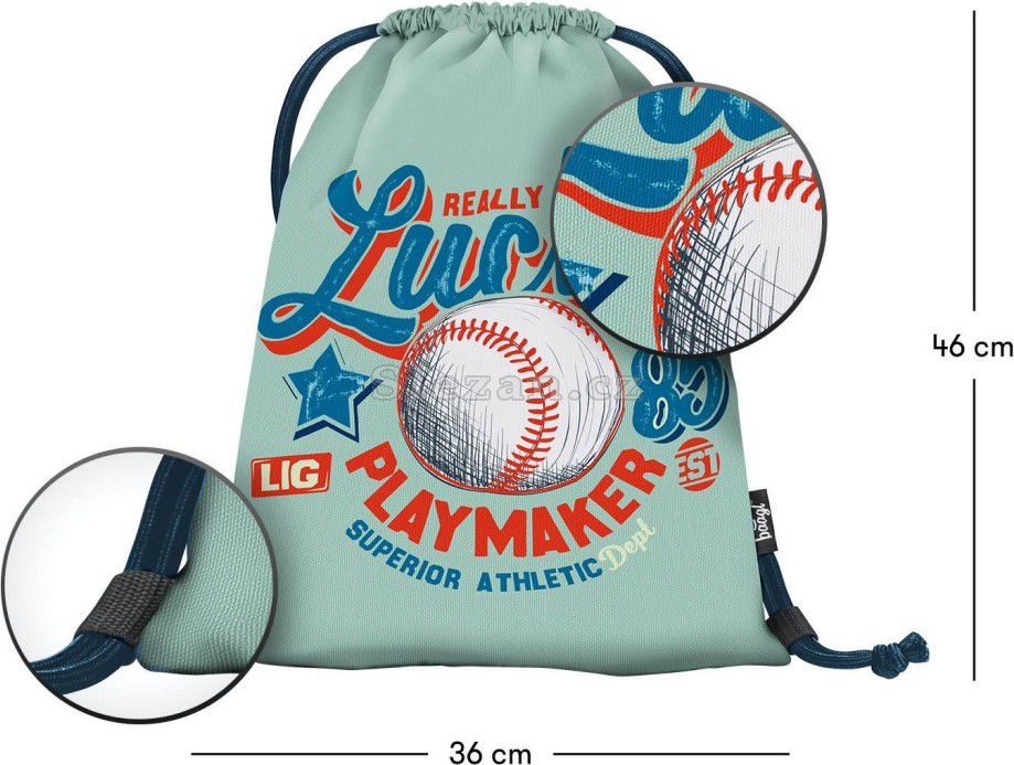 • Sáček na cvičky nebo přezůvky z pevného omyvatelného materiálu. • Zdrhování pomocí pevných tkanic, které zároveň umožňují nošení na zádech.