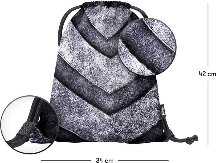 • Sáček na cvičky nebo přezůvky z pevného omyvatelného materiálu. • Zdrhování pomocí pevných tkanic, které zároveň umožňují nošení na zádech.