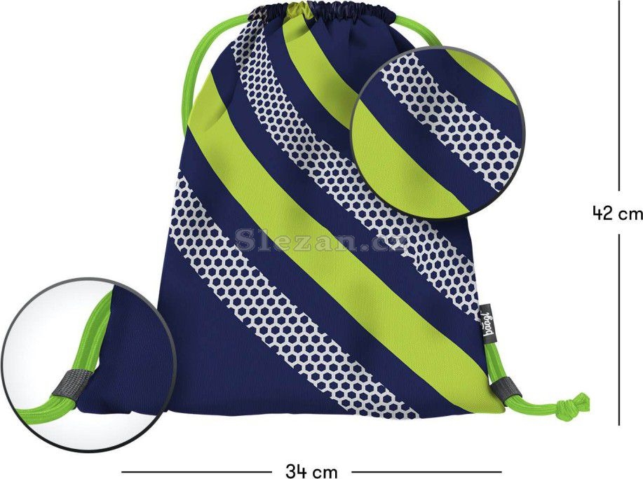 • Sáček na cvičky nebo přezůvky z pevného omyvatelného materiálu. • Zdrhování pomocí pevných tkanic, které zároveň umožňují nošení na zádech.