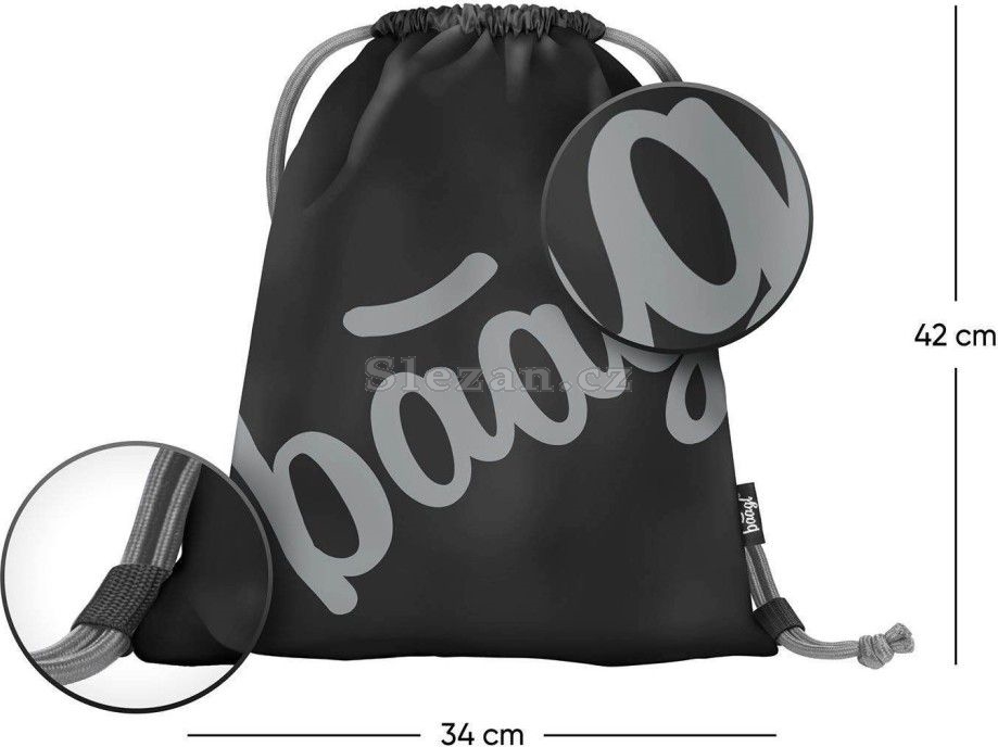 • Sáček na cvičky nebo přezůvky v černé barvě s logem Baagl, které ve tmě svítí • Zdrhování pomocí pevných tkanic, které zároveň umožňují nošení na zádech
