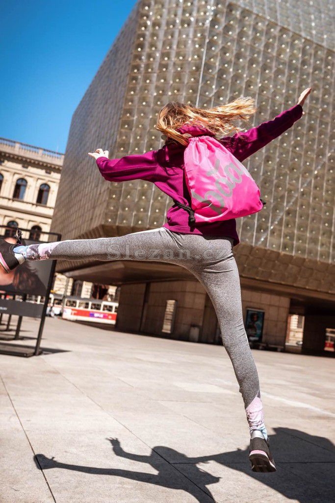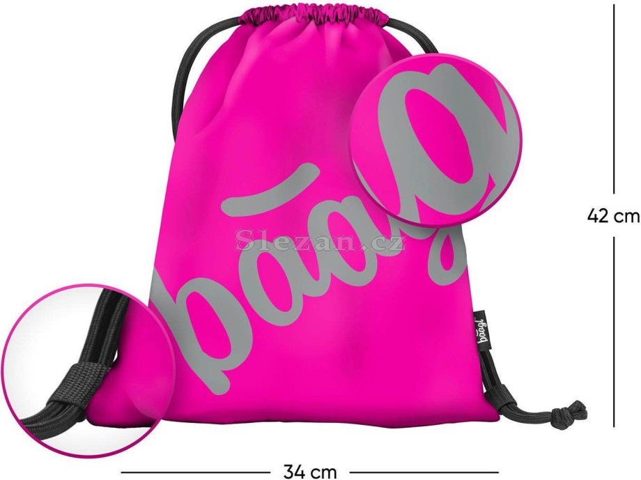 • Sáček na cvičky nebo přezůvky v růžové barvě s logem Baagl, které ve tmě svítí • Zdrhování pomocí pevných tkanic, které zároveň umožňují nošení na zádech