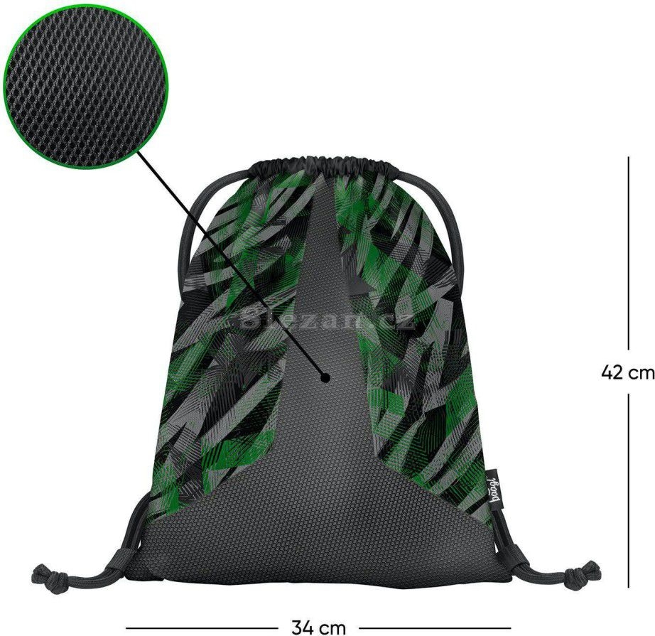 • Sáček na cvičky nebo přezůvky. •Sáček je vyroben z pevného omyvatelného materiálu, na přední straně sáčku je umístěna prodyšná síťka. • Zdrhování pomocí pevných tkanic, které zároveň umožňují nošení na zádech.