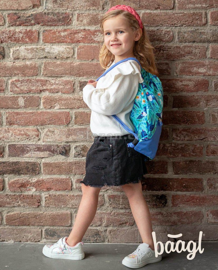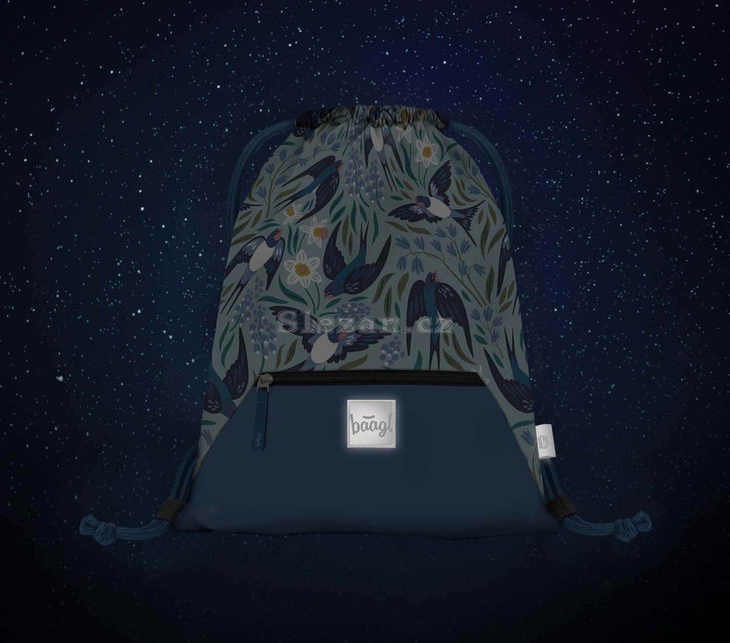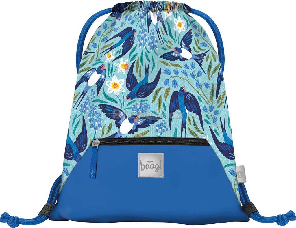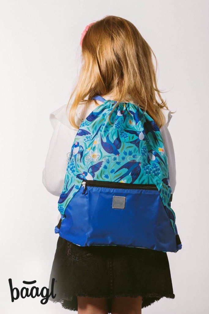 • Sáček na cvičky nebo přezůvky v modré barvě. • Sáček je vyroben z pevného omyvatelného materiálu a v jeho dolní části je umístěna praktická kapsa na zip. • Zdrhování pomocí pevných tkanic, které zároveň umožňují nošení na zádech.