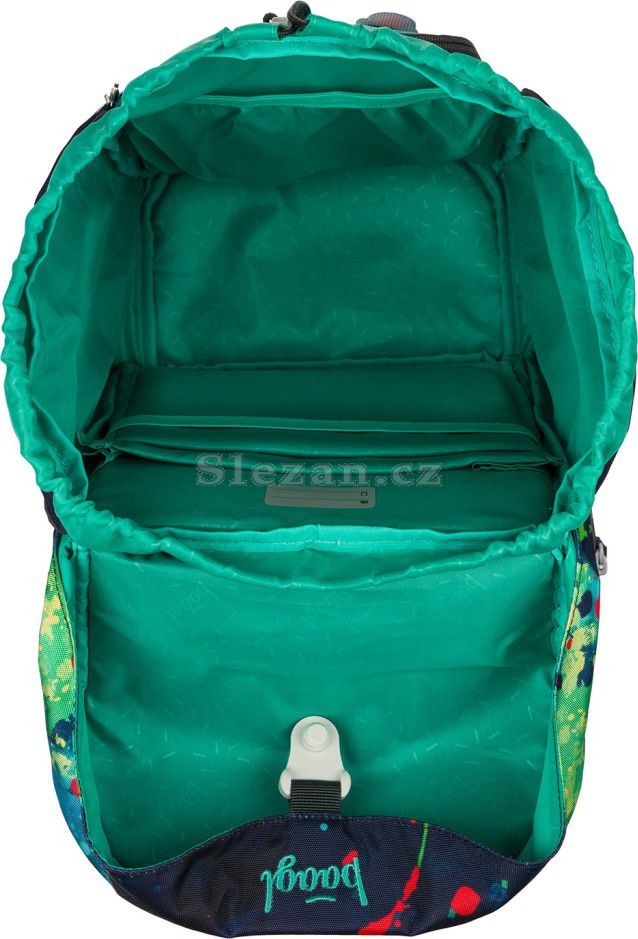 Jednokomorové vnitřní uspořádání s kapsou a gumičkou pro uchycení desek na zádové straně slouží ke snadné organizaci všech školních pomůcek.