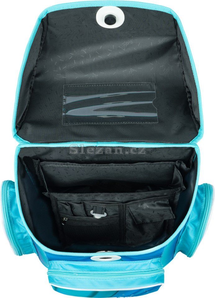 - Uvnitř aktovky je průhledná kapsa na rozvrh a vnitřní organizér umožňující rovnoměrné rozložení hmotnosti.