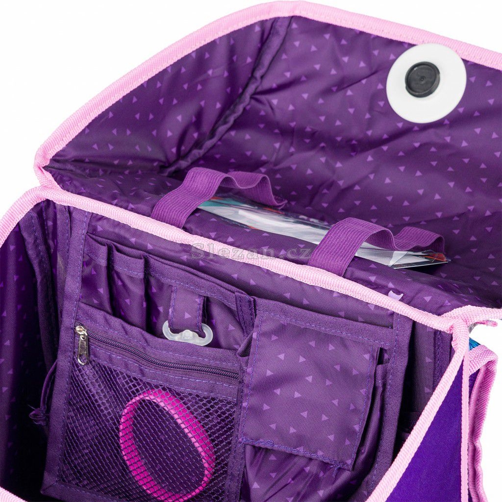 - Uvnitř aktovky je průhledná kapsa s rozvrhem a vnitřní organizér umožňující rovnoměrné rozložení hmotnosti.