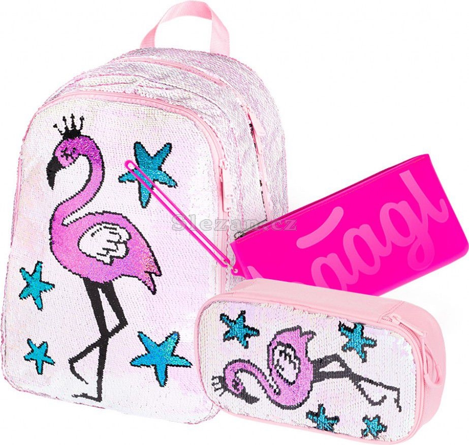 BAAGL SET 3 Fun Plameňák: batoh, penál a silikonové pouzdro