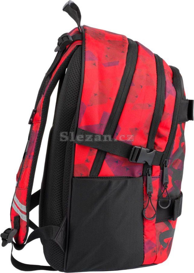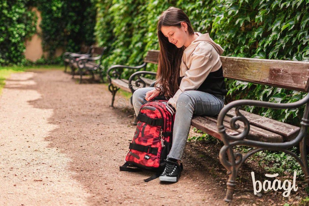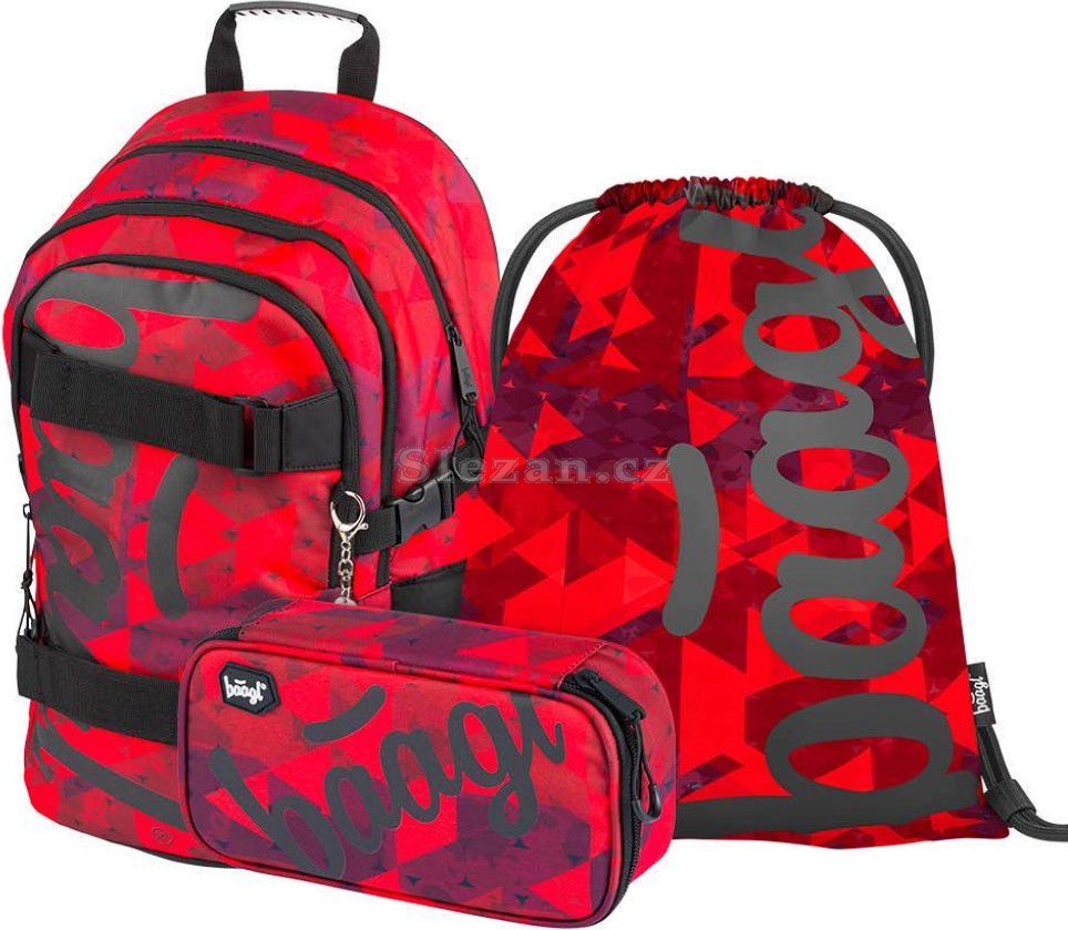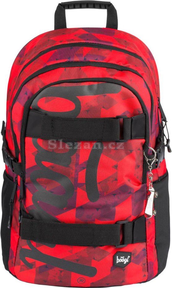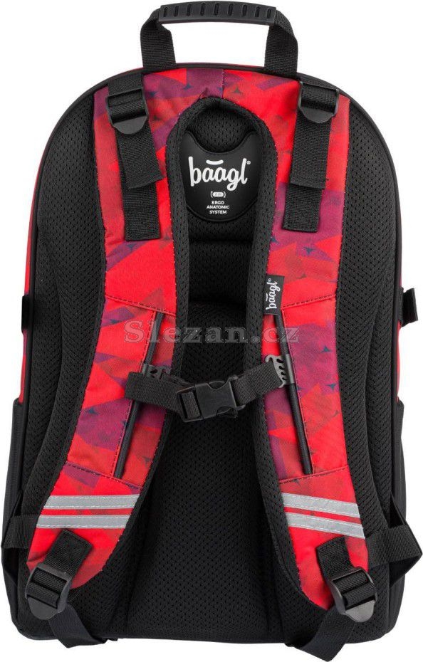 Červený školní batoh Skate Triangle a velkým reflexním logem BAAGL na přední straně. Batoh je vhodný od 3. třídy 1. stupně ZŠ a také pro 2. stupeň ZŠ.