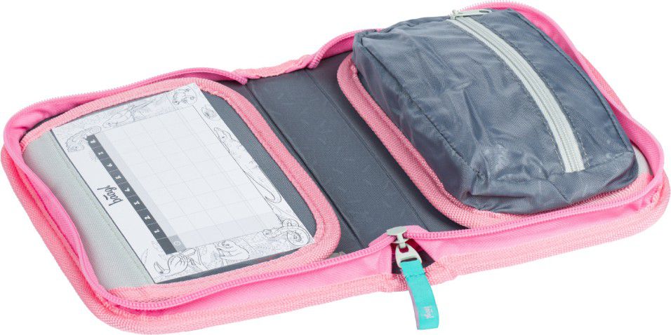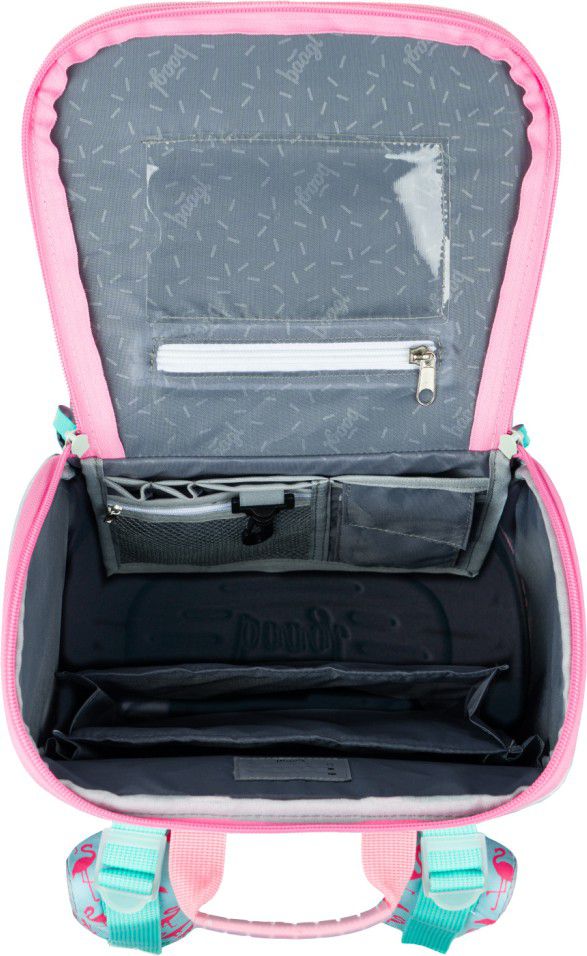 • Uvnitř aktovky je průhledná kapsa na rozvhr a vnitřní organizér umožňující rovnoměrné rozložení hmotnosti, doplněný gumičkou pro fixaci.