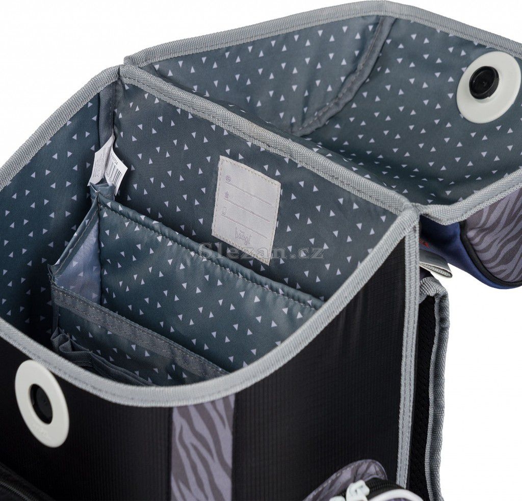 - Uvnitř aktovky je průhledná kapsa s rozvrhem a vnitřní organizér umožňující rovnoměrné rozložení hmotnosti.