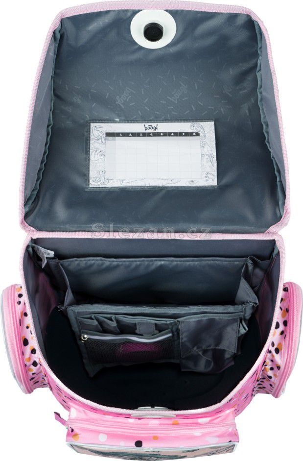 • Uvnitř aktovky je průhledná kapsa na rozvrh a vnitřní organizér umožňující rovnoměrné rozložení hmotnosti.