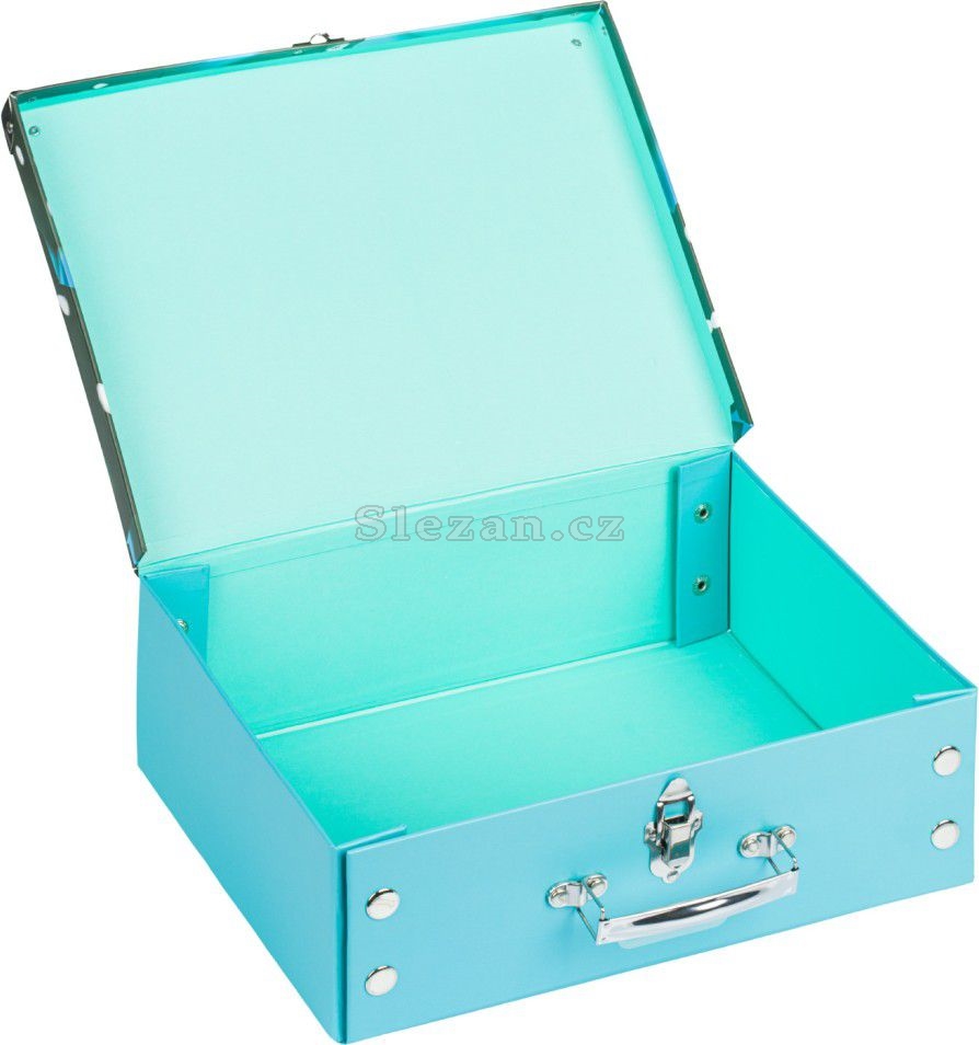 Skládací kufřík z pevného laminovaného papíru s okovanými rohy.