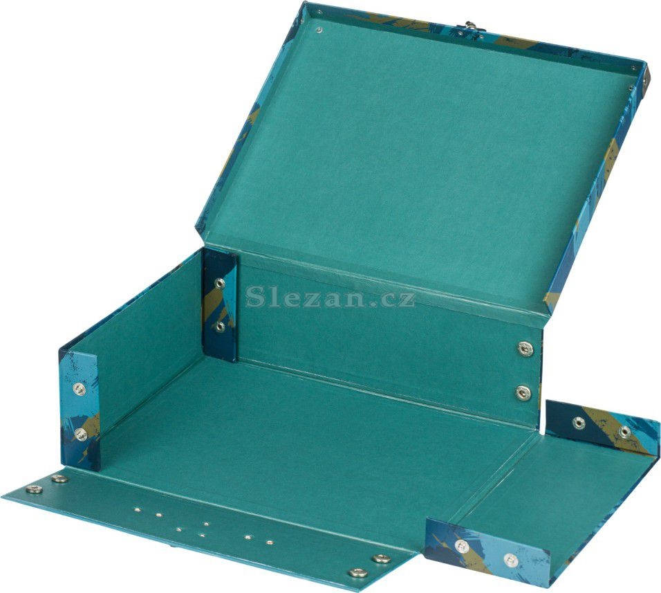 Skládací kufřík z pevného laminovaného papíru s okovanými rohy.