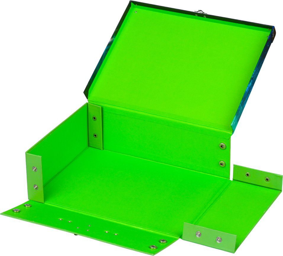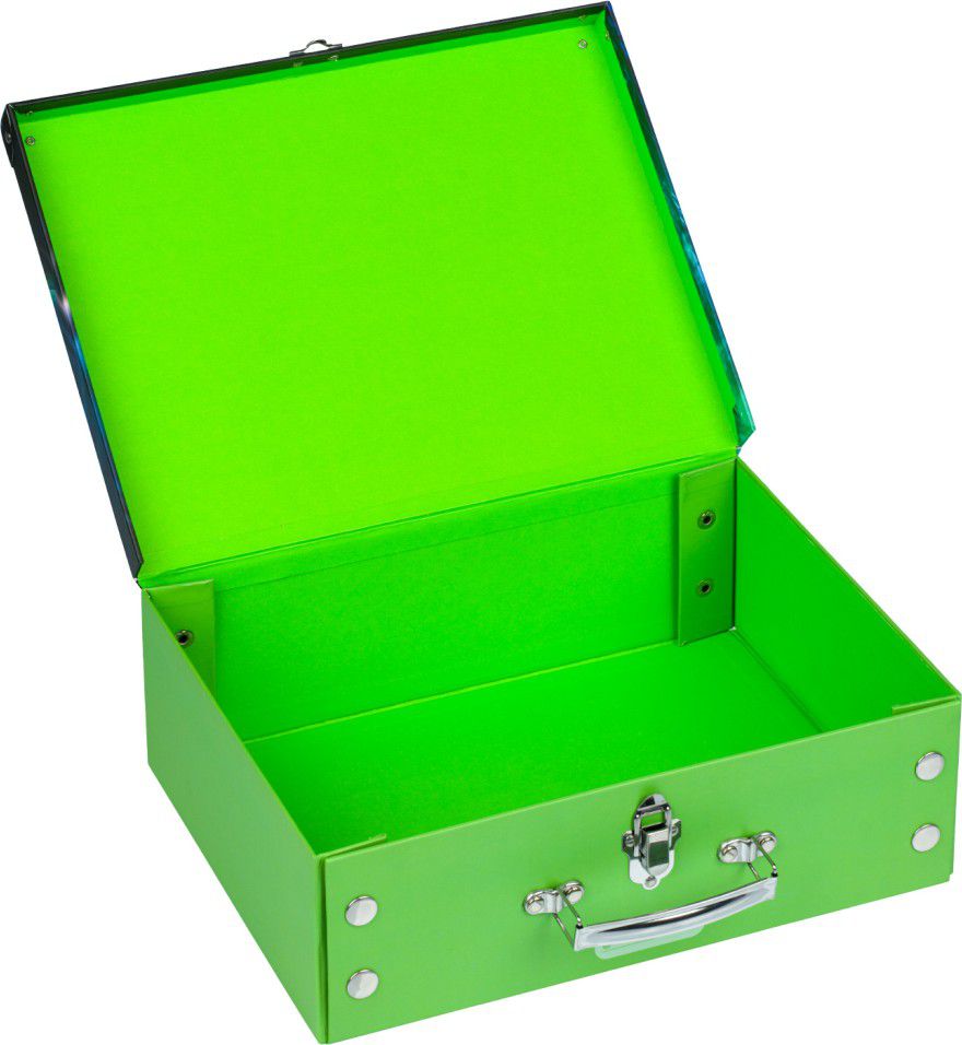 Skládací kufřík z pevného laminovaného papíru s okovanými rohy.