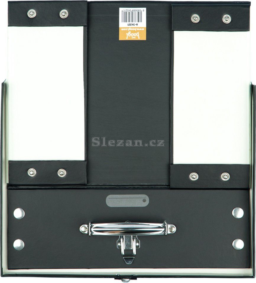 Skládací kufřík z pevného laminovaného papíru s okovanými rohy.