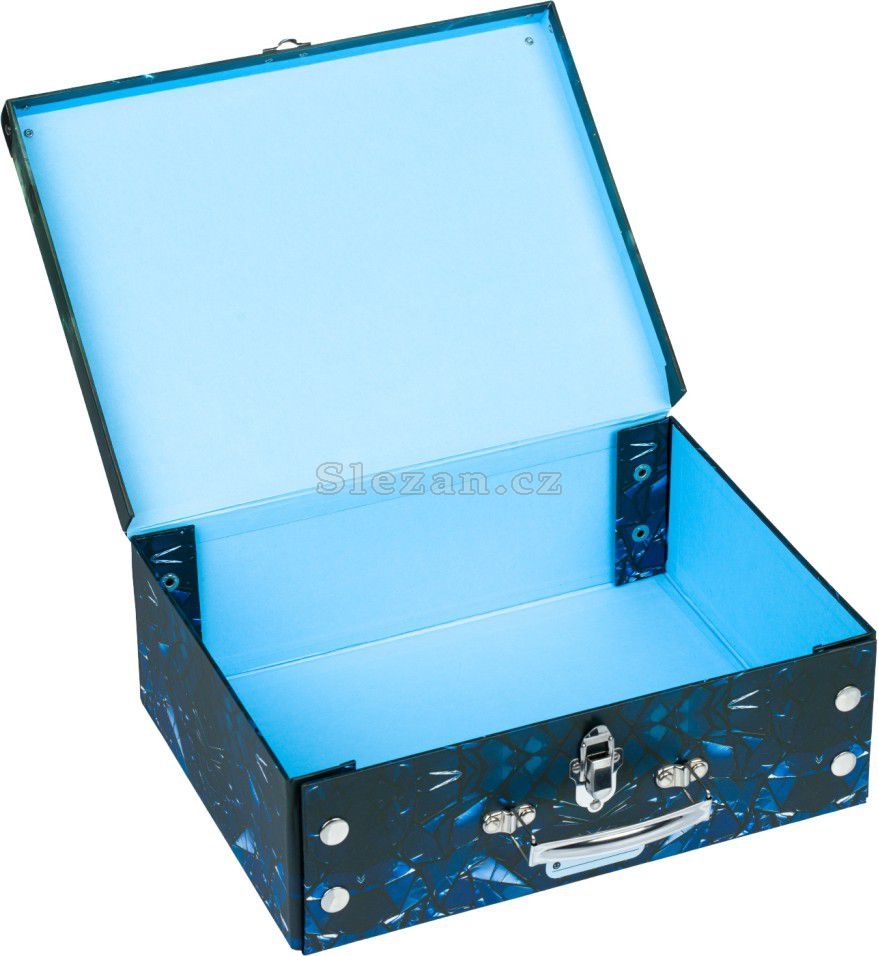 Skládací kufřík z pevného laminovaného papíru s okovanými rohy.