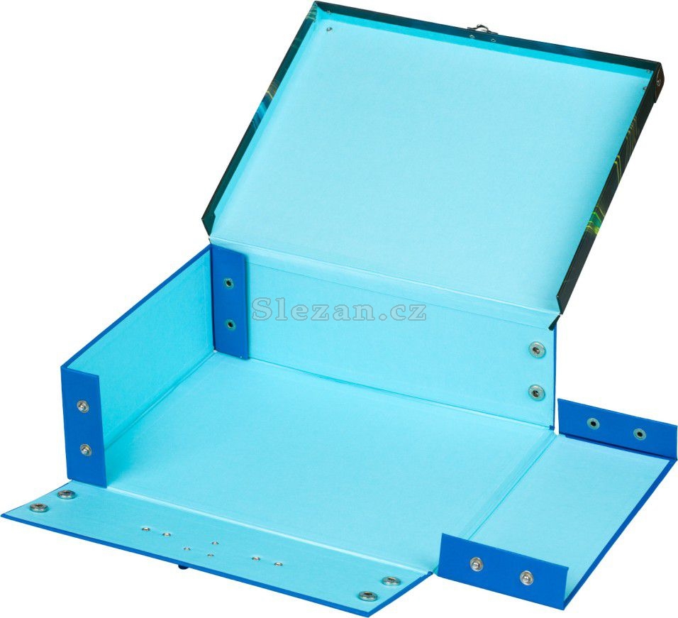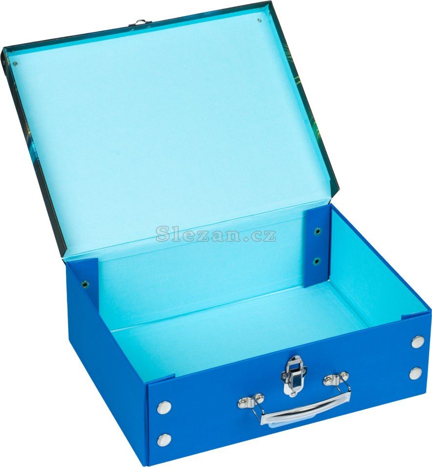 Skládací kufřík z pevného laminovaného papíru s okovanými rohy.
