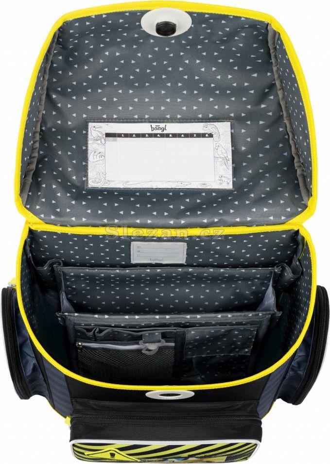 Uvnitř aktovky je průhledná kapsa s rozvrhem a vnitřní organizér umožňující rovnoměrné rozložení hmotnosti.