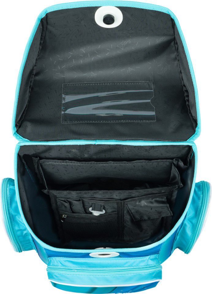 Uvnitř aktovky je průhledná kapsa s rozvrhem a vnitřní organizér umožňující rovnoměrné rozložení hmotnosti.
