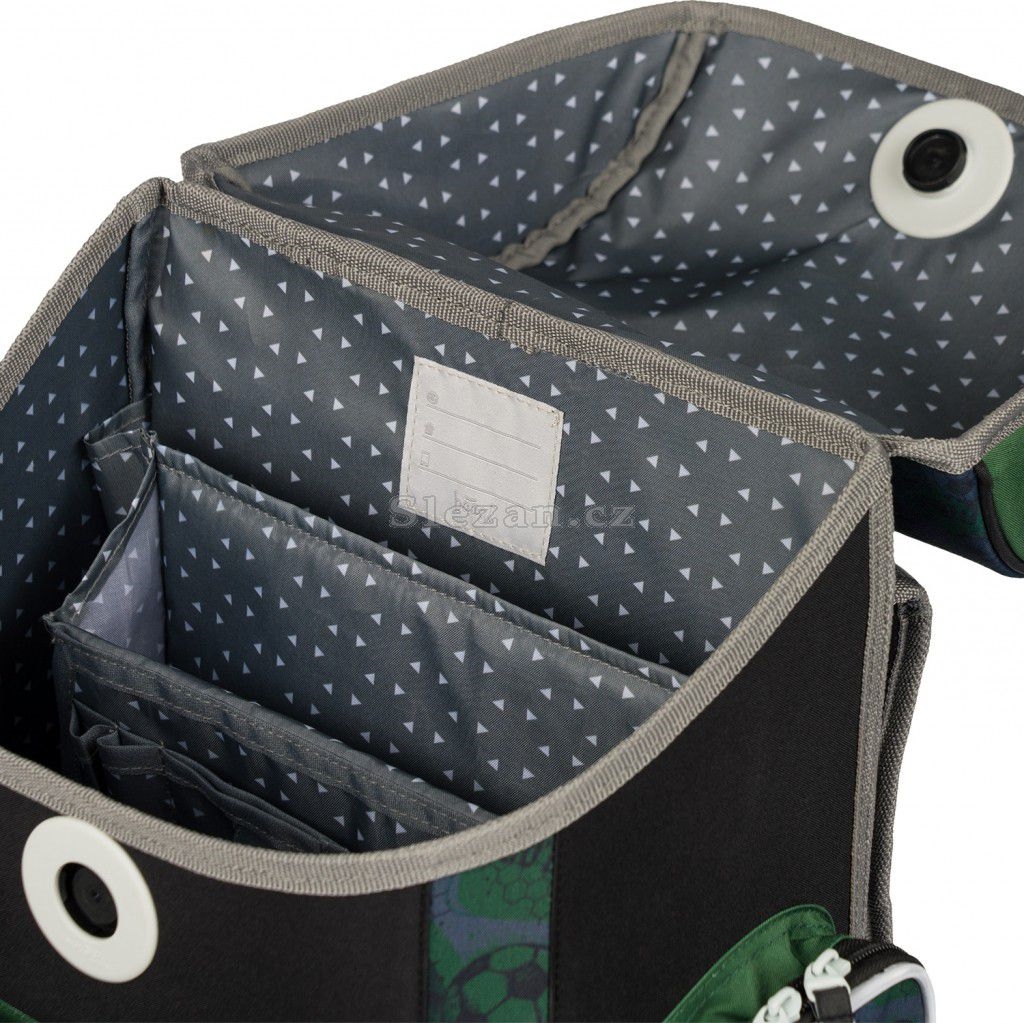 Uvnitř aktovky je průhledná kapsa s rozvrhem a vnitřní organizér umožňující rovnoměrné rozložení hmotnosti.