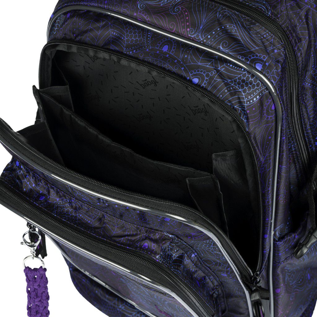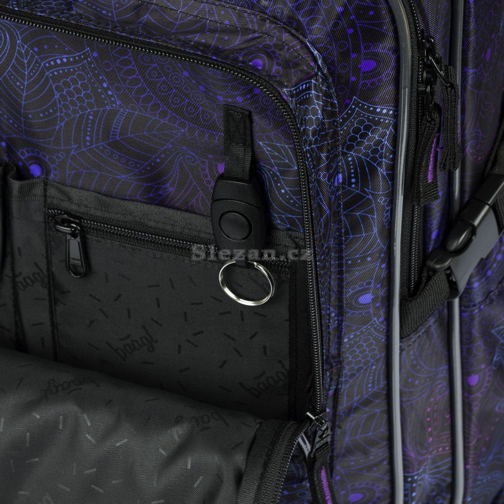 Přední komora batohu obsahuje praktický organizér a také poutko s karabinou na zavěšení klíčů. Tuto karabinu je možné odepnout a používat samostatně.