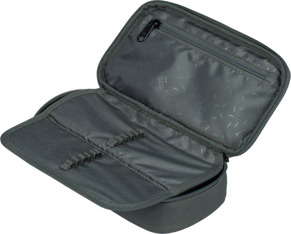 Kompaktní penál na zip s prostornou hlavní komorou a dvojitou výklopnou chlopní nabízí dostatek prostoru pro psací potřeby i drobnosti.
