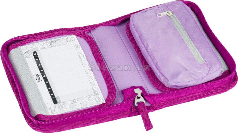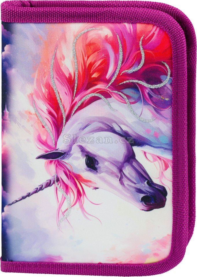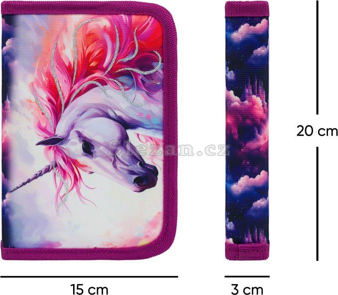 Klasický penál se dvěma chlopněmi a motivem bájného jednorožce s dvěma chlopněmi.