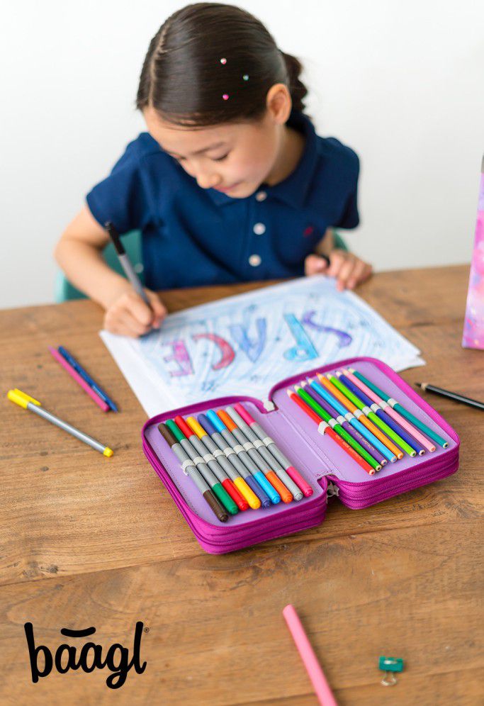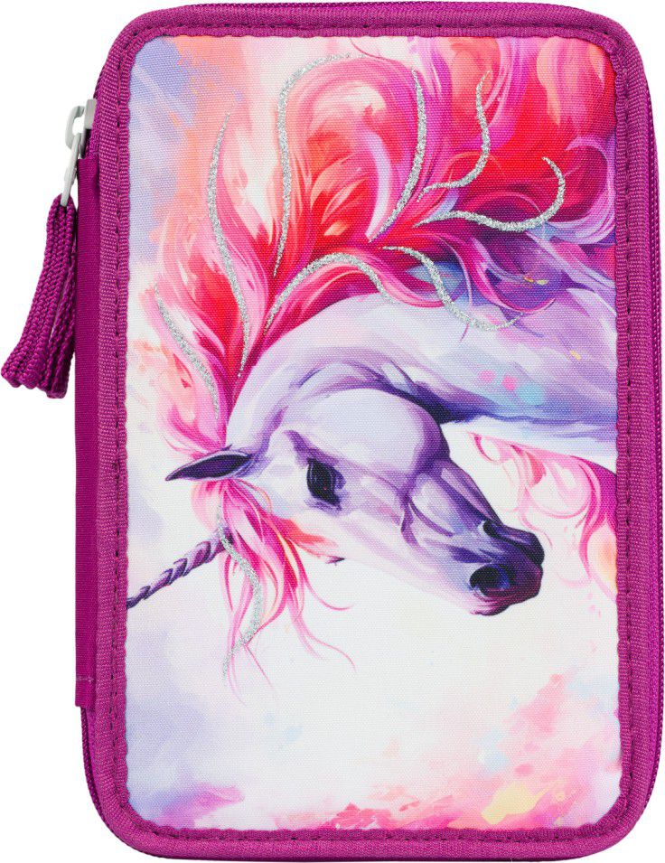 Třípatrový penál s motivem bájného jednorožce na všechny psací potřeby.
