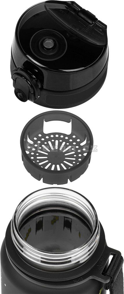Uzamykatelné víčko nepropustí ani kapku nápoje a zaručuje jednoduché a intuitivní používání. Součástí láhve je i sítko, díky kterému můžete láhev použít i na limonády s ovocem nebo čaj (materiál je vhodný i pro horké nápoje). K láhvi je připevněné také poutko pro pohodlné nošení v ruce.