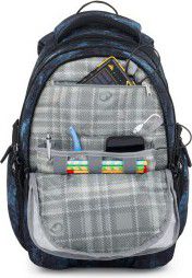Černomodrý školní batoh pro všechny školáky, kteří potřebují místo na spoustu věcí.