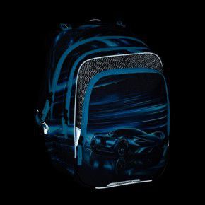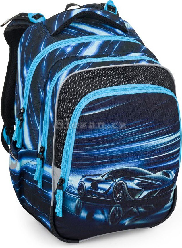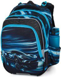 Tříkomorový školní superbatoh pro prvňáčky, kteří mají rádi auta a modrou barvu.
