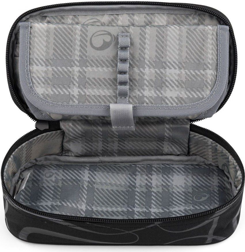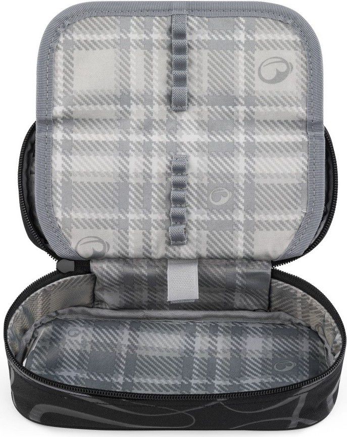 Pouzdro má jednu komoru s dvojitou přepážkou a kupou pružných úchytů na všechny potřebné pomůcky.