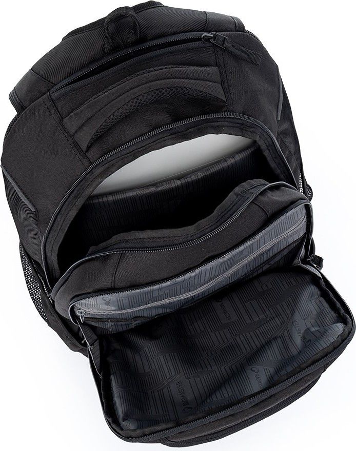Černý dvoukomorový urban batoh s polstrovanou kapsou na notebook, organizérem, měkkou kapsou na brýle a dalšími menšími kapsičkami.
