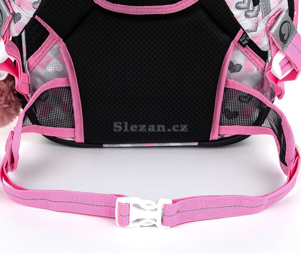 Ramenní popruhy jsou anatomicky tvarované a měkce polstrované. Popruhy je možné individuálně nastavit dle velikosti vašeho školáka, a to pomocí dolních plastových spon umístěných na ramenních popruzích. Součástí batohu je flexibilní hrudní páska k fixaci popruhů na ramenou školáka. Koncovky popruhů s reflexním prvkem a magnetem snadno uchytíte na konce ramenního pásu. Boční poutko pro uchycení navijáku na čip nebo klíče. Díky důmyslnému umístění tak vždy vklouznou přímo do boční kapsy.
