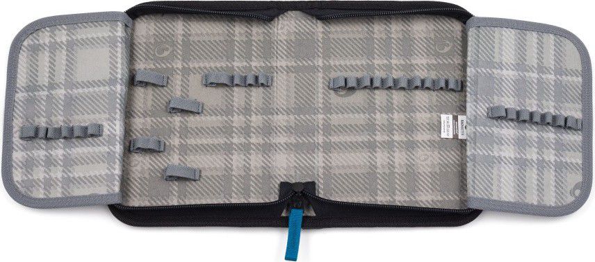 V 39 gumových úchytech rozmístěných na dvou otevíravých chlopních je dostatek místa na pera, tužky a pastelky.