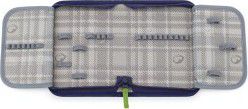 V řadě gumových úchytů rozmístěných na dvou otevíravých chlopních je dostatek místa na pera, tužky a pastelky.