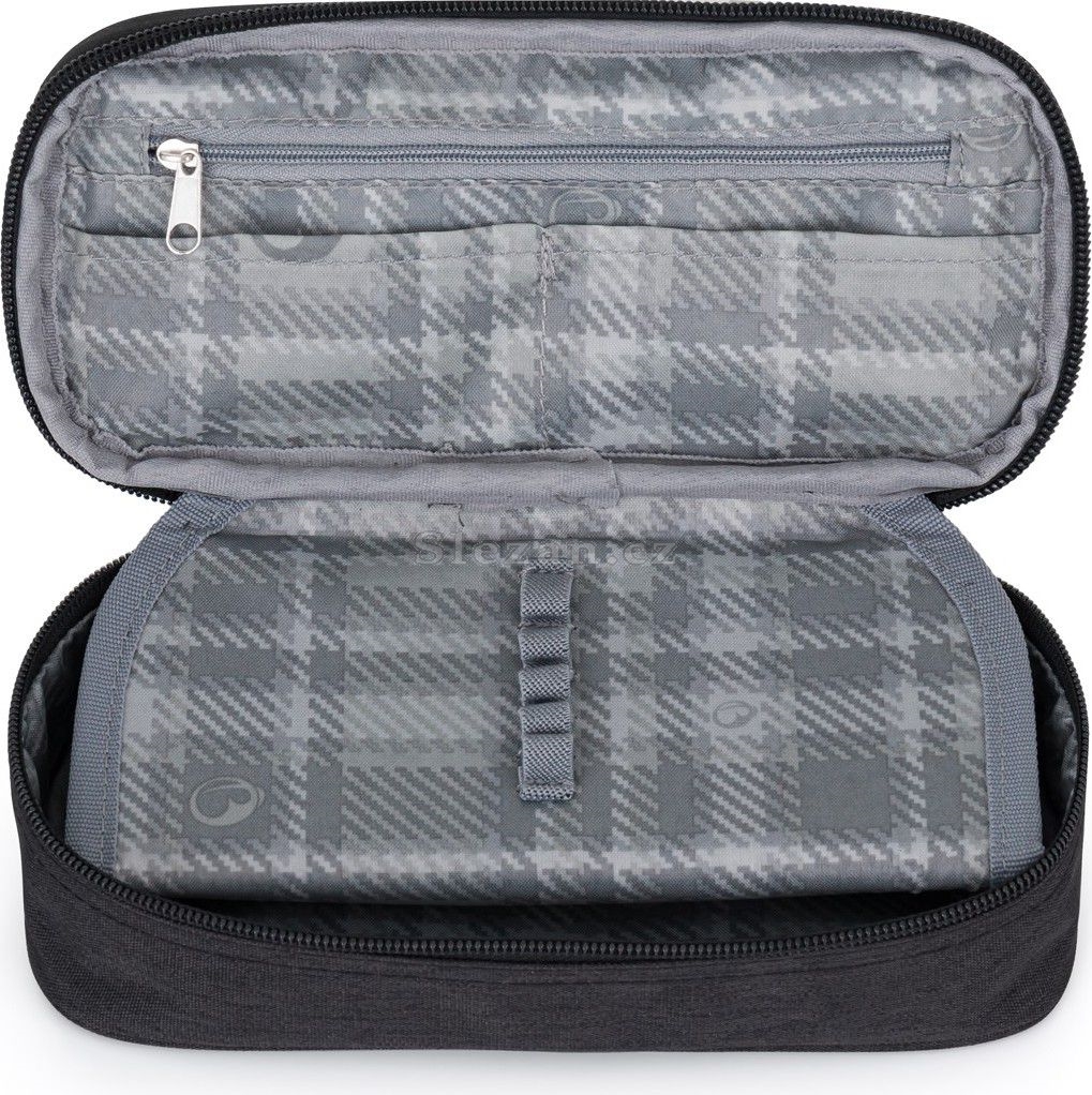 Pouzdro je jednokomorové s dvojitou přepážkou a gumovými úchyty na psací pomůcky.