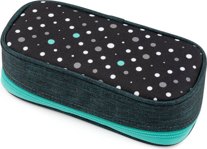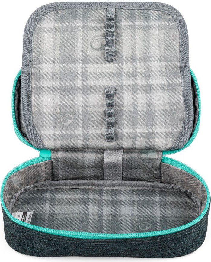Pouzdro je jednokomorové s dvojitou přepážkou a gumovými úchyty na psací pomůcky.