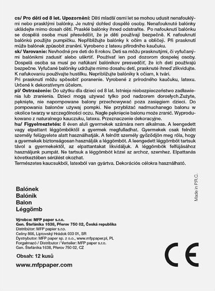 VAROVÁNÍ: Vhodné pro děti od 8 let. Děti se mohou prasklými či vyfouknutými balónky zadusit nebo uškrtit. Používejte pouze pod dozorem dospělé osoby. Dospělá osoba se po nafouknutí balónku musí přesvědčit, že jej děti používají bezpečně. Vyfouklé balónky udržujte mimo dosah dětí a prasklé ihned zlikvidujte. K nafukování balónků použíjte pumpičku. Nepřibližujte balónky k očím a obličeji. Při prasknutí může balónek způsobit zranění.