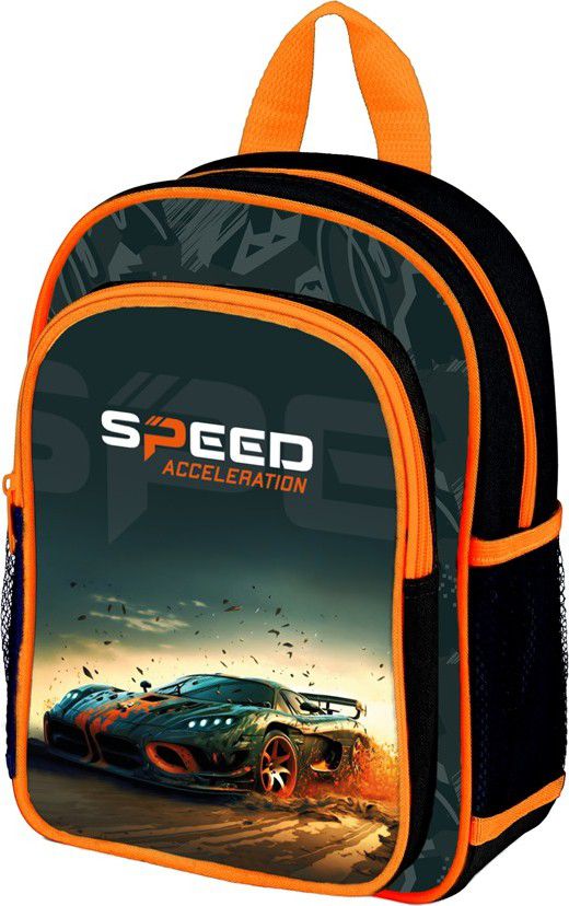 Má jednu velkou kapsu, menší kapsu na svačinu a postranní kapsičky na lahev na pití.