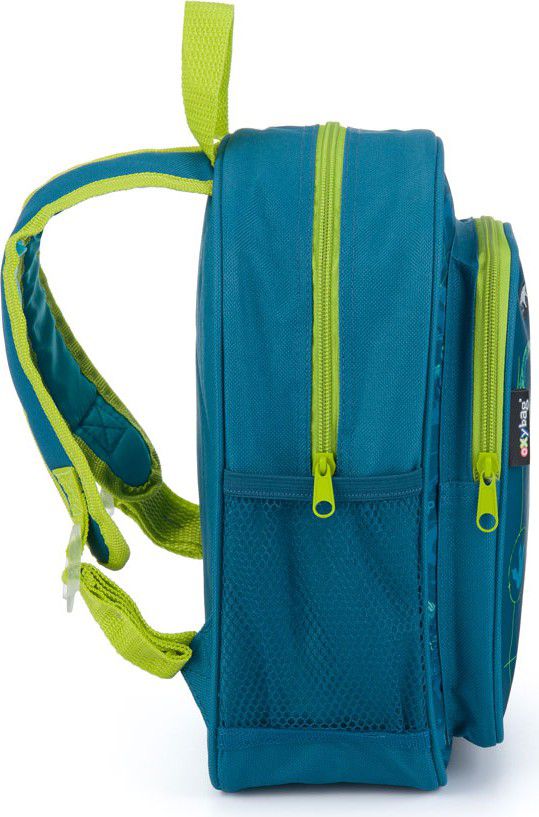 Má jednu velkou kapsu, menší kapsu na svačinu a postranní kapsičky na lahev na pití.