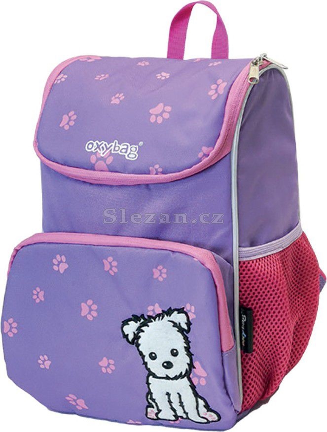 Má jednu velkou kapsu, menší kapsu na svačinu a postranní kapsičky na lahev na pití.