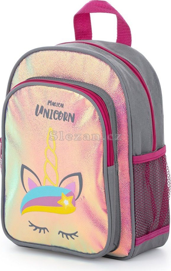 Má jednu velkou kapsu, menší kapsu na svačinu a postranní kapsičky na lahev na pití.