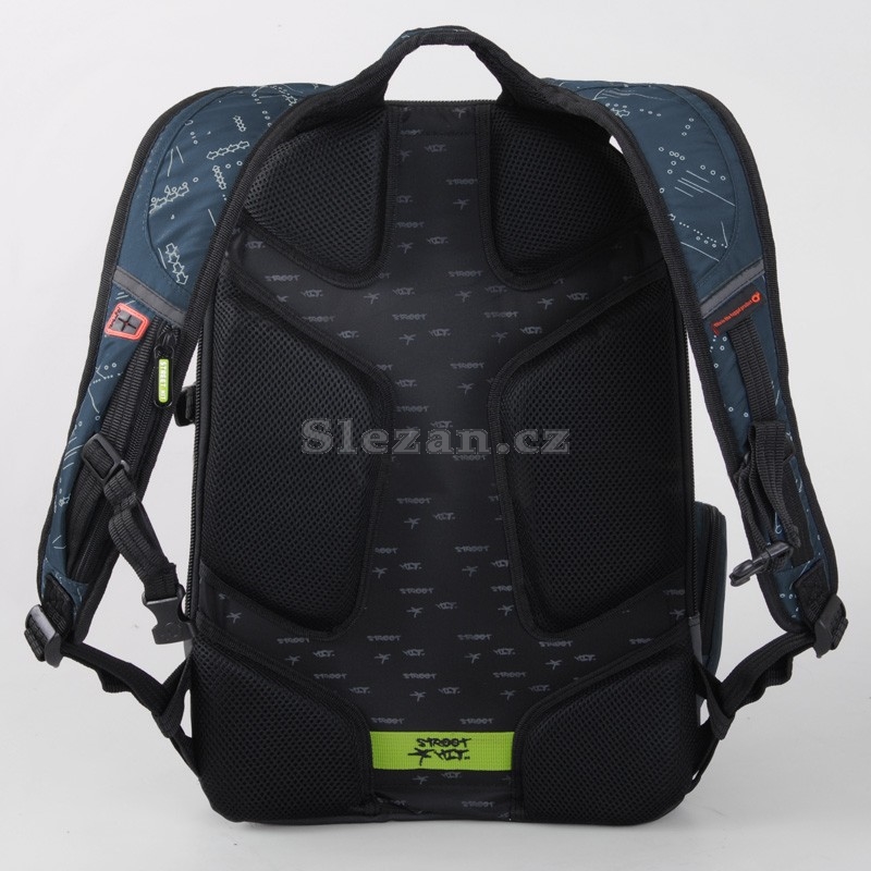 Prostorný dvoukomorový batoh s trendy potiskem. Batoh je určen pro všestranné použití – do školy, do města, na kratší výlety, popřípadě i na sport. Tento batoh primárně doporučujeme pro každodenní nošení od 2. stupně základních škol. Batoh má ergonomicky tvarovaný zádový systém s hliníkovou výztuží. Polstrované a délkově nastavitelné ramenní popruhy jsou po stranách chráněny lemovkou. Společně s posuvným kompresním hrudním pásem na přezku zajistí pohodlné každodenní nošení. Zadní komora tohoto batohu je užší, určená převážně pro umístění složek, dokumentů nebo jiných písemností. Do této zadní komory lze po vyjmutí hliníkové výztuhy také umístit notebook až do velikosti 15,4" v neoprenovém obalu. Přední komora tohoto batohu je prostornější, svou velikostí je ideální pro uschování většiny objemnějších věcí. Jsou v ní dvě menší uzavíratelné kapsičky – jedna klasická a druhá ze síťoviny. Přední komora obsahuje i polstrovanou kapsu na mobil, iPod a jednoduchý organizér na tužky. Po obou stranách batohu jsou malé kapsy. Na jedné straně je jednoduchá zipová kapsa, na druhé pak zipem uzavíratelná kapsa se síťkou na PET láhev a kompresním popruhem s přezkou k jejímu pevnějšímu uchycení. Do síťované kapsy si můžete pohodlně umístit 1,5l láhev s pitím a následně ji zafixovat stabilizačním popruhem. Přední část batohu nabízí další dvě menší kapsy na zip. Do těchto kapes si můžete uložit drobnosti nebo jiné věci, které chcete mít „po ruce“. Obě kapsy jsou vybaveny uzavíratelnými kapsami ze síťoviny, ve spodní pak naleznete karabinu na klíče. Na jednom z ramenních popruhů batohu je kapsička na mobil nebo MP3 přehrávač s průvlekem na sluchátka. Batoh je doplněn o reflexní plochy, úchyt na přenášení v ruce je součástí ramenních popruhů. Dno je chráněno zpevněným pogumovaným materiálem.