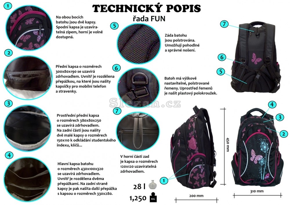 Žákovský batoh má tři hlavní kapsy. Přední kapsa batohu je uvnitř rozdělena přepážkou, na které jsou našity kapsičky pro mobilní telefon a stravenky. Prostřední kapsa má na své zadní straně našity dvě kapsy pro odkládání žákovská knížky a klíčů.. Hlavní kapsa je uvnitř rozdělena dvěma přepážkami, pro lepší uložení školních pomůcek (sešitů, knih). Na své zadní straně má našitu další přepážku s kapsou. Na obou stranách batohu jsou dvě menší kapsy k odkládání láhve s pitím, peněženky, kapesníčků. Žákovský batoh je vybaven polstrovanými zády, pro pohodlné a správné nošení. Dále je vybaven polstrovaným držadlem a výškově nastavitelnými řemeny, na kterých je našita plastová karabina, která umožňuje pevnější usazení batohu na zádech. Jako hlavní materiál je použit Polyester 600D 72T s vodoodpudivou úpravou a při celkových rozměrech v.450 x h.200 x š.310 mm a objemu 28 litrů, váží batoh pouhých 1,250 kg